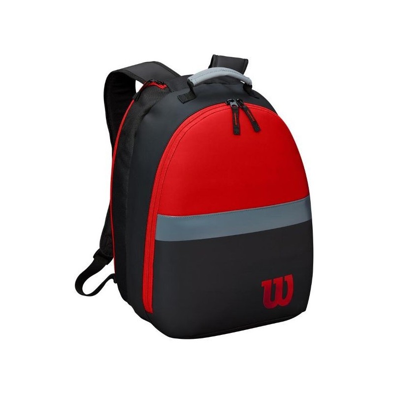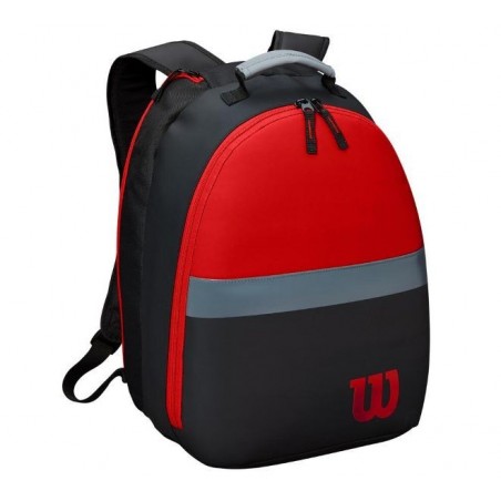 A children's Wilson backpack is in black and red for two racquets. He's got everything the big one has.